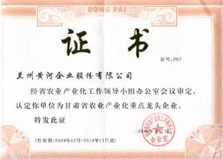 日前,甘肅省農(nóng)業(yè)產(chǎn)業(yè)化工作領(lǐng)導(dǎo)小組辦公室向蘭州黃河企業(yè)股份有限公司頒發(fā)了甘肅省農(nóng)業(yè)產(chǎn)業(yè)化重點(diǎn)龍頭企業(yè)證書。這是我公司自2004年被認(rèn)定為甘肅省農(nóng)業(yè)產(chǎn)業(yè)化重點(diǎn)龍頭企業(yè)以來,第三次獲此殊榮。